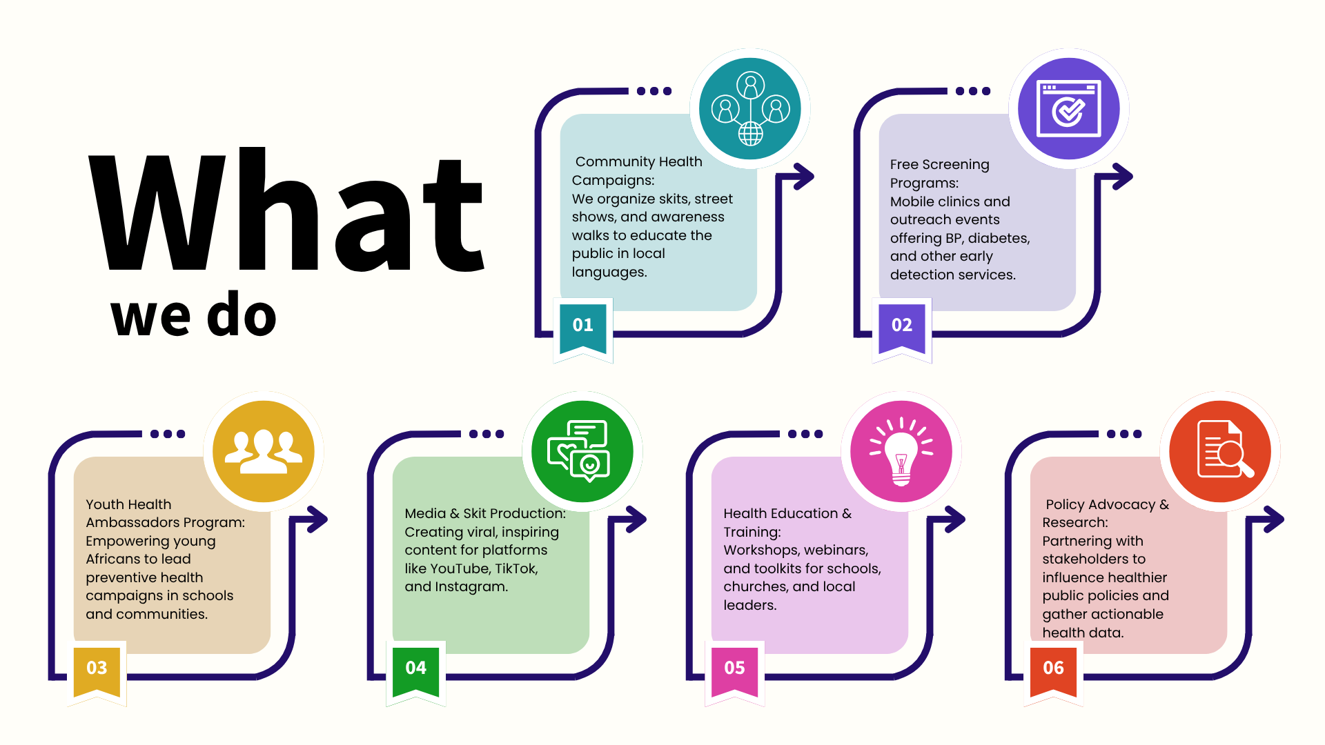 Community First, Preventive Action, Youth Inclusion, Innovation in Health, Data-Driven Change.